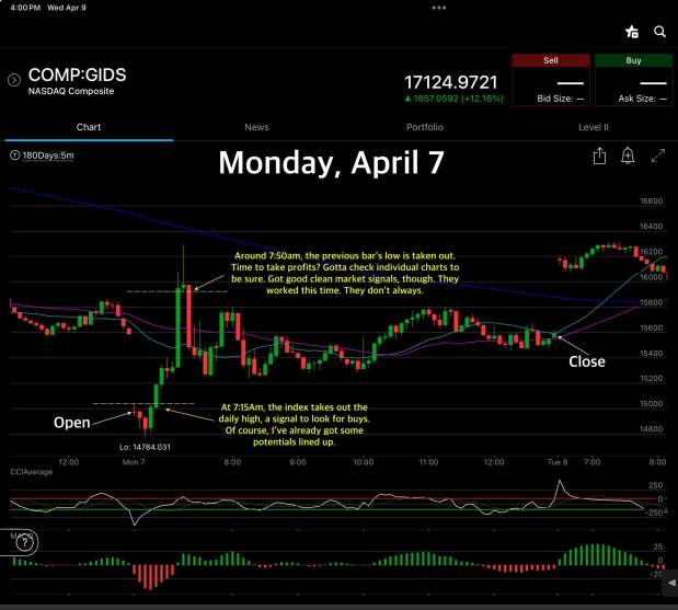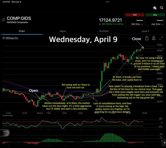 What awesome day to day trade. That’s one of the few good things that happens when the market sells off as rapidly as it did. Eventually it gets so deep into oversold territory there’s a nice spring back for some good short term trading. It’s easy to get fooled, though, and I’ve been waiting to pounce for days now. It looked like it might bounce on Monday, when it gapped down at the open and then headed up almost immediately. The rally fizzled at 7:15am (PST), although there were a few gains to be had. Then yesterday (Tuesday), it gapped up at the open, and looked like I might catch a wave. It immediately faded, however, and got I caught with a few losers. Nothing terrible, though. Then today, it again gave a head fake at the open, and I dabbled a little for another net loss. Then it started basing at the daily high, and I got a little excited. Around 10am (PST), it took the base out, faltered for a beat and then sailed. Made for a great day and a big sigh. I’ll include some NASDAQ charts with annotations so any interested day traders can see what I did. I’ll more often use the futures rather than the actual indexes for signaling, but in this case, I did use the index. Why the NADSAQ? Because I like to day trade tech stocks, which I find are usually more volatile and agreeable for big swing day trades and scalps. Hopefully, you can make out the charts.