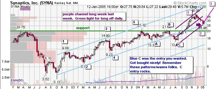 SYNA: What a beautiful example of a C entry. Followed by channel long week last week that's being bought. Look for nice long 3rd wave to highs above 40 within the next 5 months.