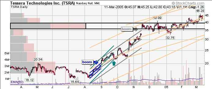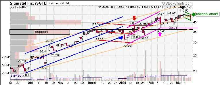 Longer term, TSRA looks especially bullish right now so if I had a good entry below 32.75ish, I'd be tempted to hold it, despite my bearish market view and only get concerned if a significant channel break occurs. SGTL had a channel short on Friday, but that in itself isn't a reason to think the overall bullish trend is over. Both weekly charts are very impressive. The trend is your friend, and their trends have been pretty much unaffected by general market movement. If you do hold them you have to be prepared to lose the value between prices now and the channel breaks, so if this doesn't suit you, then yes, take profits and try for lower entries.
