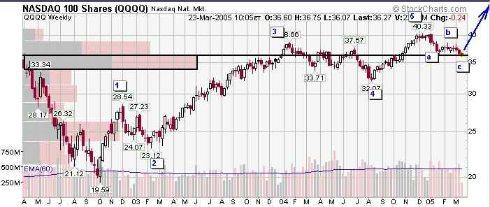 And also, note something technically significant: The QQQQ has a 12345abc 'c' entry point. If it gets bought, we could see a multi-week rally to new highs. This is off a weekly chart, so it's not going to happen overnight....but if the c works, the next few weeks are gonna be nice for bulls.Last edited by spikefader; 03-23-2005, 11:21 AM.
