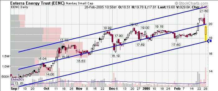 Lesson: Appreciate the power of channel longs and wedges/triangles! EENC is acting very bullish and busted the channel from the Dec high with force. It looks headed to the upper channel from the 13.15 low, which targets 23ish. Look for up to 5 more days of push. Might rest for a bit in between like recent bullish pushes, but I wouldn't be surprised if this one moves up another couple bucks. It's way too late for entry though in my book. Best to ya.