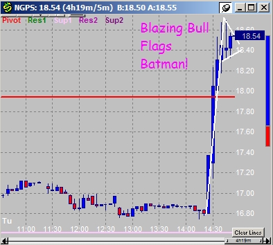 I hope Tomrich is wrong in this instance (i.e., NGPS and ESMC have similar charts and perhaps similar fates). I checked ESMC this morn and its at 5.59 per share. NGPS was down $1.17 to $17 range this morn as I write. Perhaps you've got the best advice, Runner.Originally posted by RunnerI'm staying clear from NGPS!!