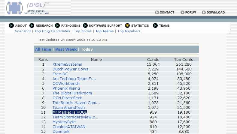 The Mr. Market is HUGE D2OL team, under the inspiring leadership of spikefader, has reached a truly impressive milestone. As of this day, the team ranks 100th in the alltime contributions list. Time for pats on the back, high-fives, cool beer, and the sobering realization that the fight against disease will take a lot more effort, dedication, and: computer time.